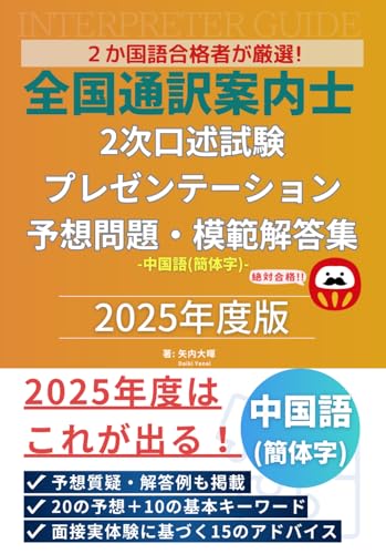 本書は、全国通訳案内士の2次口述試験に向けたプレゼンテーション予想問題と模範解答を収録した2025年度版です。中国語(簡体字)対応で、合格を目指す方に最適な参考書です。