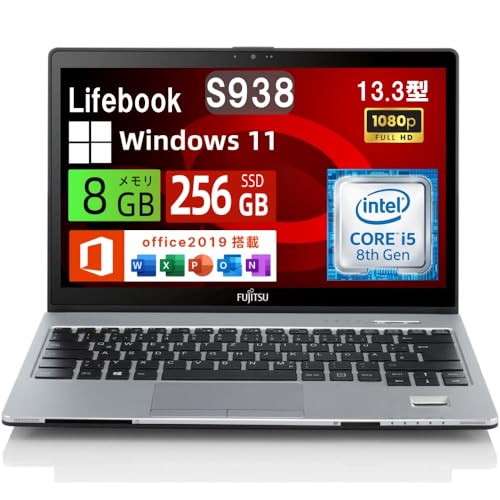 富士通 LIFEBOOK S938は、13.3型FHD液晶、Core i5-8250U、8GBメモリ、SSD 256GB搭載。超軽薄デザインで、Webカメラ、Wi-Fi、USB Type-C、HDMIを装備。Windows 11とMS Office 2019付属。