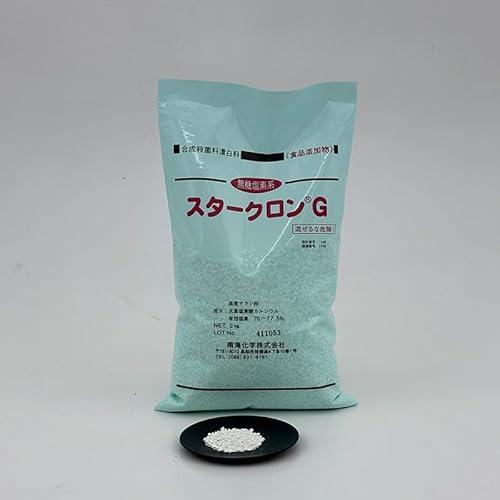 スタークロンG(2kg)は、次亜塩素酸カルシウムを含むプールや飲料水の消毒用塩素剤で、オリジナルスプーン、取扱説明書、塩素計算シート、濃度確認試薬付きです。ハイクロンFHの代替品として利用可能です。
