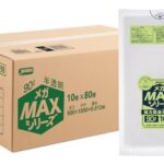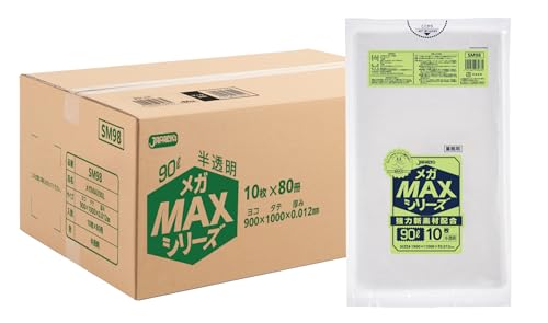 ジャパックスの90L半透明ゴミ袋は800枚入り(10枚x80冊)、厚み0.012mmで引張り強度が強く、ポリ袋SM98としてまとめ買いが可能です。