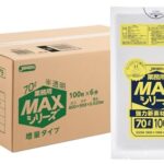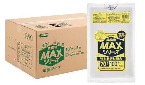 ジャパックスの70L半透明ゴミ袋は600枚(100枚x6冊)入りで、厚み0.02mm。引張り強度が強く、ポリ袋タイプのSP79。まとめ買いに最適なケース販売です。