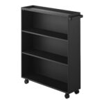 ハンドル付きの隠せるコミックラック「タワー ブラック」。キャスター付きで移動もスムーズ。3段のスリムデザインで、漫画や書籍の収納に最適な本棚です。山崎実業製。