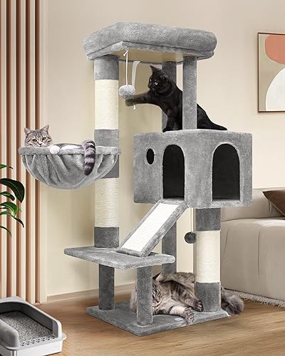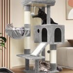 グoblazerキャットタワーは、116cmの高さで多機能なコンパクトデザイン。シニア猫から子猫まで使え、ハンギングバスケットや見晴台付き。太い支柱と天然麻紐の爪とぎポールで安定性抜群、運動不足解消にも最適です。