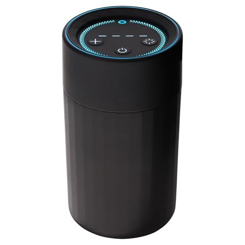 カーメイトの置き型芳香剤は最長約20ヶ月持続し、ドレスアップライト付き。ブラックカラーで、車載用の自動噴霧機能を備え、強力かつ調節可能なイルミネーションディフューザーです。