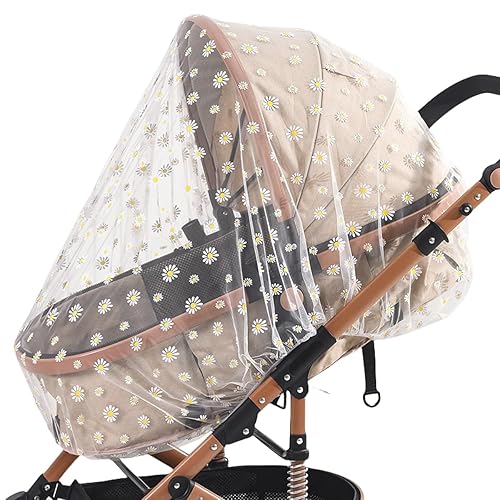 ベビーカー用虫よけカバー。蚊帳とメッシュ素材で360度保護。軽量で通気性良好、取り付け簡単。折りたたみ式で持ち運び便利。おしゃれな花柄デザイン(ホワイト)。