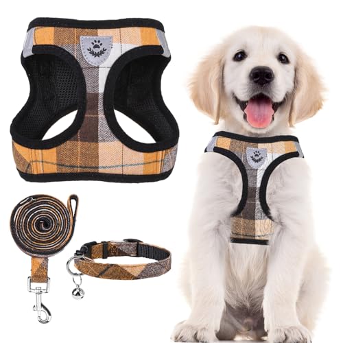 PUPTECK犬ハーネスリードセットは、反射素材やマジックテープ付きで、犬に優しいデザイン。調節可能で軽量、通気性にも優れています。老犬介護にも適し、散歩や訓練に最適です。XXSサイズ、オレンジチェック柄。