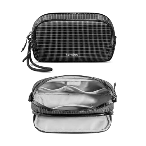 tomtoc大容量ガジェットポーチは、PC周辺小物を収納できるトラベルポーチです。ケーブルやアダプター、モバイルバッテリー、マウスが整然と収納可能。撥水加工で、出張や旅行に最適、二層構造で自立する便利なバッグです。