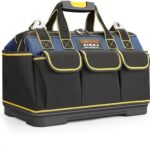 おしゃれな大型工具箱。19ポケットの大容量で、折り畳み可能、耐久性のある防水素材使用。軽量設計で肩掛けベルト付き、持ち運びやすく車載にも便利です。