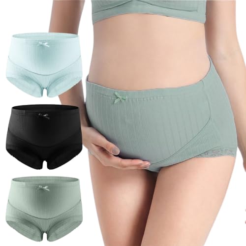 Boobergのマタニティショーツはハイウエストデザインで、くすみカラーのライトブルー、アッシュミント、ブラックの3枚セット。肌に優しく、締め付け感がなく妊婦向け。レースと綿素材使用。