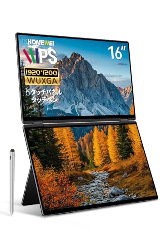 EHOMEWEIの16インチデュアルディスプレイは、1920*1200のIPSタッチパネルを搭載。折りたたみデザインで、薄型6mmのため持ち運びに便利。ミラーリングと拡張機能をサポート。