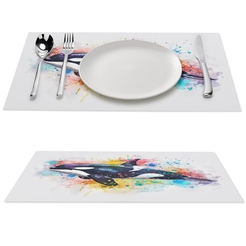 シャチの水彩スプラッシュデザインのランチョンマット。PVC製で柔軟性、防汚・断熱・滑り止め機能あり。お手入れ簡単、丸洗い可能。キッチンやレストランに最適なモダンなプレースマット。