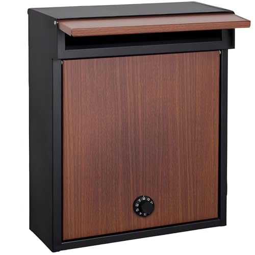 ロック付きメールボックス。コンビネーションロックで安全。屋外用の木目調ドア付きの大型ブラックメタルドロップボックス。サイズは30×13×37cmで、郵便物をしっかり収納。