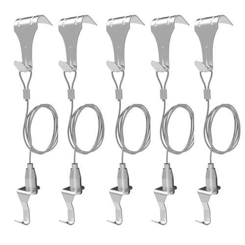 YUGUOCHENGのピクチャーレールワイヤーセットは、1mのワイヤーが5本入り、ステンレス製で耐久性があります。スライド式フックは高さ調整が可能で、展示物のレイアウトを自由に調節できます。