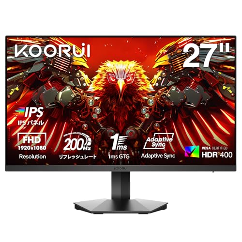 KOORUIの27インチゲーミングモニターは、IPSパネルを採用し、200Hzのリフレッシュレートと1msの応答速度を実現。HDR400対応で、90% DCI-P3の広色域をサポート。非光沢仕上げ、ブルーライト軽減機能、HDMI/DisplayPort対応、Adaptive Sync機能も搭載。