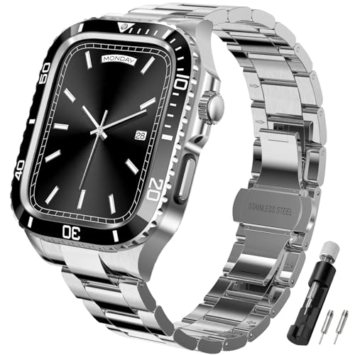 OOULOVEのコンパチブルApple Watchバンドは、9/8/7 45mm及びSE2/6/5/4/SE 44mmに対応。耐衝撃性と耐久性を備え、メタルケースと一体型デザインで男性向け。