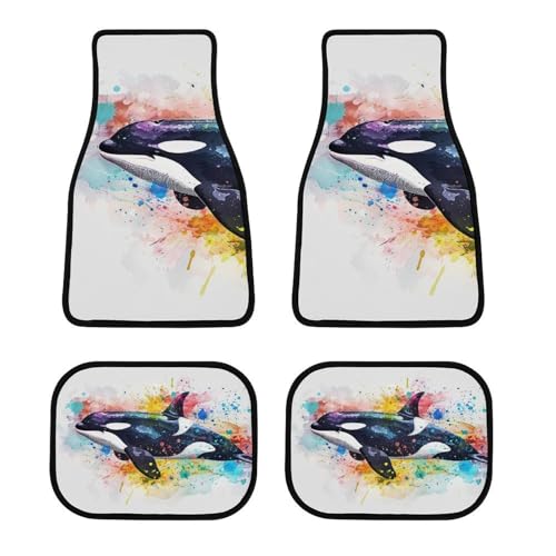 シャチの水彩スプラッシュペイントのカーマット4点セット。動物イラストアートのモダンなデザイン。フロント2枚、リヤ2枚で、丸洗い可能。ズレ防止加工、防水、滑り止め、耐汚れ機能付き。軽/普通車に対応。