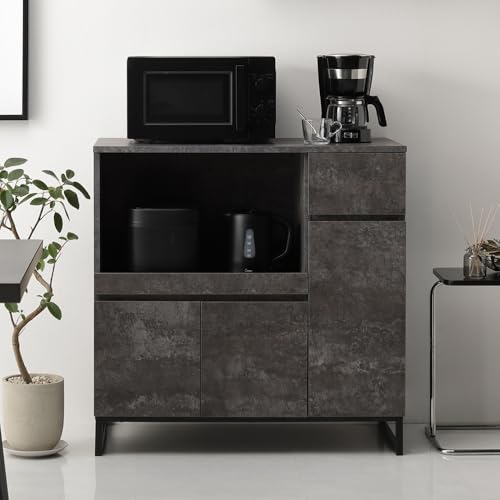 RASIK レンジラックは、幅90cmのストーングレー仕上げのキッチンカウンターです。スライド棚と引き出し、扉収納を備えたロータイプで、お客様組立タイプ。