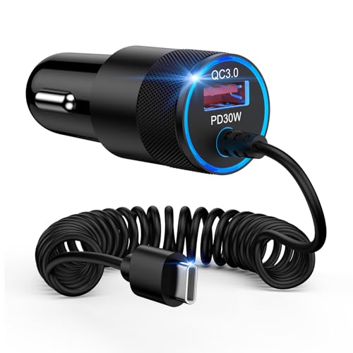 業界初の伸縮コイルケーブル搭載!48Wの急速充電が可能なUSB Cカーチャージャー。2ポート対応でiPhoneやAndroid、MacBookにも最適。1.2Mケーブル、虹色LED搭載、12V/24V対応。
