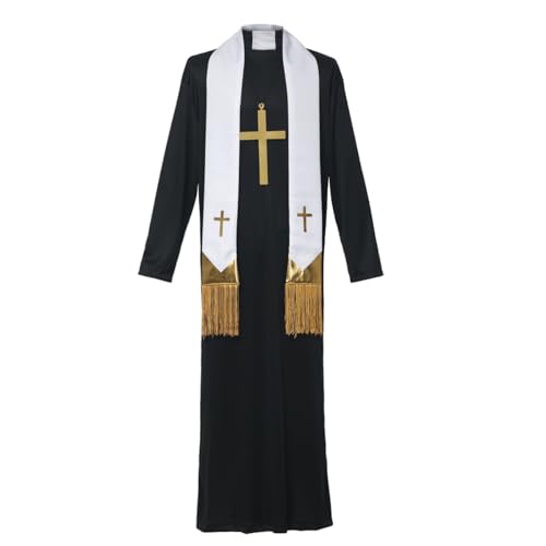 黒いローブ、白いストール、十字架がセットの司祭衣装。ハロウィンや学園祭、パーティーに最適。大人用の男性向けで、修道士や牧師の仮装にぴったりなアイテムです。
