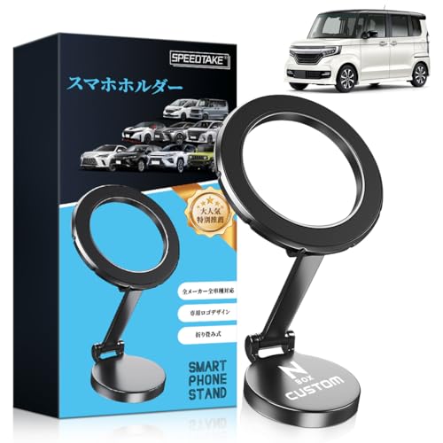 SPEEDTAKEの新型NBOXカスタム車載スマホホルダーは、マグネット式で360度回転機能を搭載。片手で操作可能で、強力粘着剤により安定性抜群。日本語説明書付きで簡単取り付け、見た目も美しい限定パッケージ。