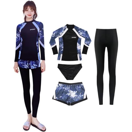 Guooolexの4点セットラッシュガードは、長袖、ラッシュレギンス、ショートパンツ、ブラを含み、UVカット機能で日焼けを防ぎ、水陸両用で使用可能。サイズはXL。