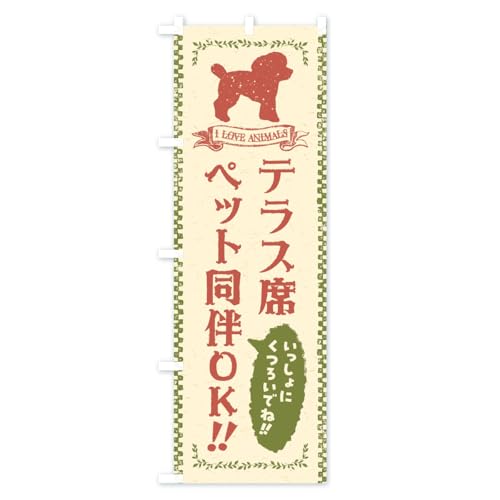 テラス席ペット同伴OK のぼり旗は、レギュラーサイズ60x180cmで、左チチのデザインです。屋外での利用に最適な耐久性があり、店舗の集客をサポートします。ペット同伴可能な方に嬉しいお知らせを伝えるためのグッズです。