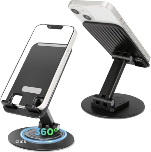 携帯電話ホルダーは折りたたみ式でデスクトップに最適。360度回転し、高さ調節可能。iPhoneを含むすべての携帯電話に対応。色はブラック。