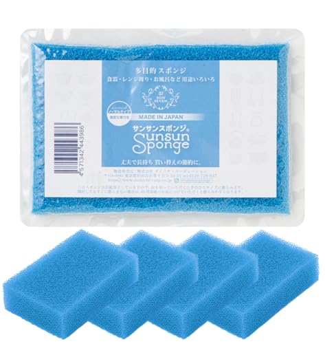 サンサンスポンジの4個セットは、食器洗いやお風呂、レンジ周りなど多用途に対応。驚きの水切れと泡立ちを誇り、丈夫で長持ちするキッチン用品です。色はブルーで、使いやすいノーマルタイプです。