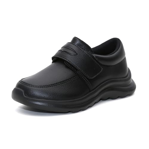 シュンソクのキッズスニーカーは、男女兼用で15~24.5cmのサイズ展開。2E幅でフィット感抜群。カラーはシックなブラックで、ローファータイプのデザインが特徴。