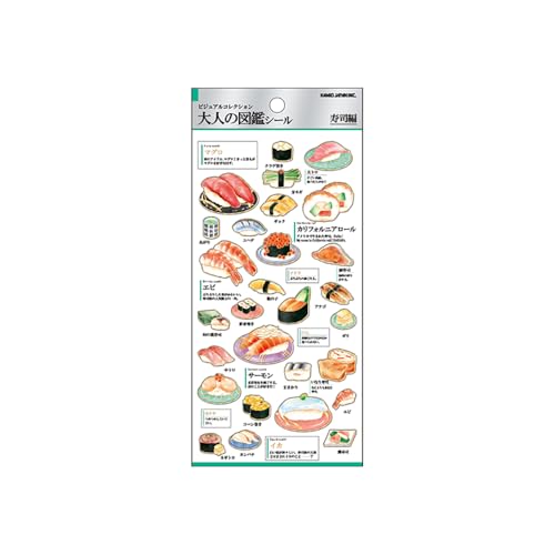 カミオジャパンの大人の図鑑シール「寿司」は、リアルで美しい寿司のイラストが特徴のシールセット。約40枚のシールが入り、コレクションやデコレーションに最適です。アート感覚で楽しめる商品です。