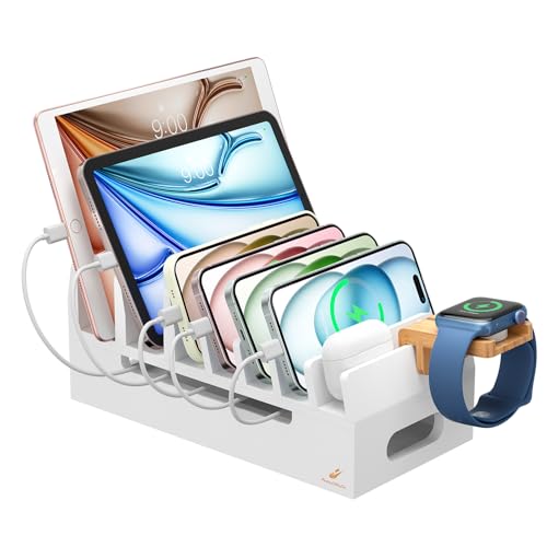 Pezin & Hulinの充電スタンドは竹製で、スマホ/タブレットを7台、スマートウォッチを1台同時に収納可能です。注意:充電ハーバは別売りです。