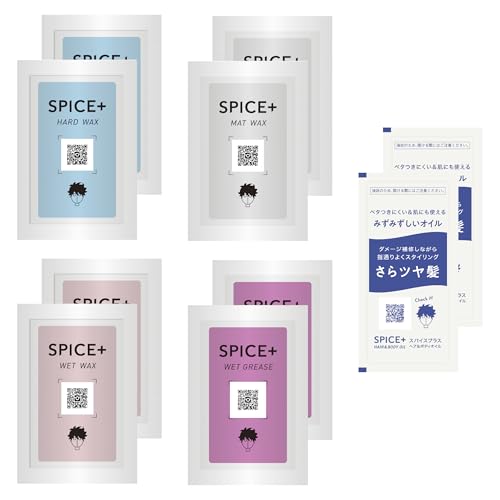 SPICE+(スパイスプラス)の【お試しパウチ5種×2個セット】は、ハード・ウェットグリース・ウェット・マットの4種のワックス各3gと、ヘア&ボディオイル2mL×2個がセット。多彩なスタイリングを楽しめるお試しサイズです。