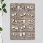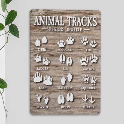 ウッドランドアニマルトラックフィールドガイドのレトロなブリキ看板。サイズ7 x 10.5インチで、自然テーマの装飾に最適。教師や両親への誕生日プレゼントにぴったり。