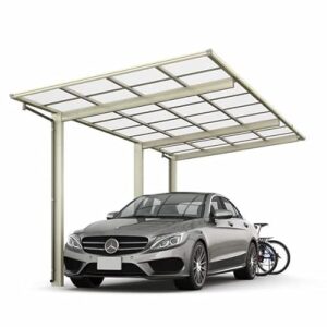 YKKカーポート エフルージュ FIRST Z 750タイプは、ハイデザインでおしゃれな単体セットです。熱線遮断ポリカーボネート板を使用し、ハイルーフ柱(H25)で1台用車庫に適合。色はステインウォールナット/ステン。