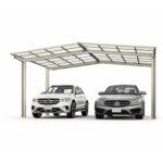 YKK カーポート エフルージュ FIRST Z 750タイプのM合掌セット。ハイルーフ柱を使用し、一般ポリカーボネート板を装備。複合カラーはステインウォールナット/ステン。2台用のガレージでDIYにも最適です。
