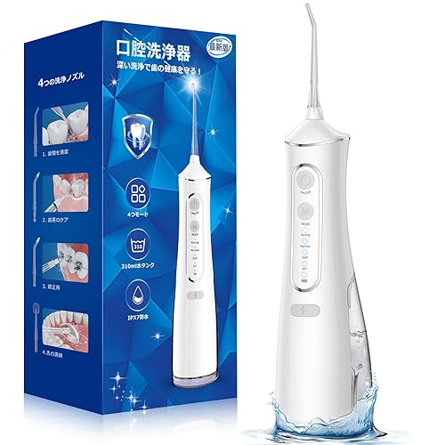 口腔洗浄器は、歯垢除去率99.9%で、4種類のノズル、360°回転設計、舌クリーナー、4水流モード、20-150PSI水圧調整、310mlタンク搭載。IPX7防水、USB充電式、コンパクトで家庭や旅行に最適。