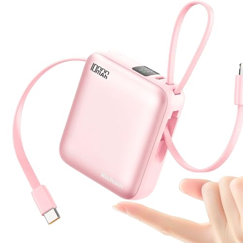 小型軽量の10000mAhモバイルバッテリー。2つのケーブル内蔵で3台同時充電可能。急速充電対応、USB-Type C入出力ポート、ディスプレイ搭載、安全回路保護。旅行やアウトドアに最適な桜色。