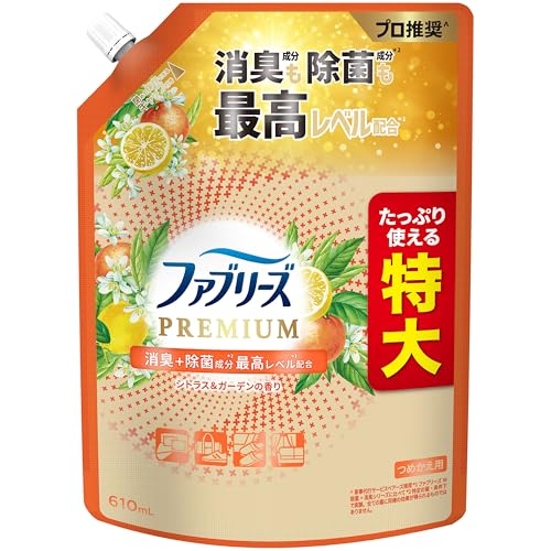 ファブリーズ PREMIUM 消臭スプレーは、シトラス&ガーデンの香りで衣類・布製品に最適な消臭剤です。除菌成分最高レベル配合、特大610mLの詰め替えボトルです。