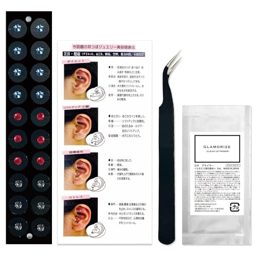 耳つぼジュエリー スターターキットには、耳つぼシール20粒(チタン製金粒)と説明書が付属しています。セルフケアに最適なトライアルセットで、耳つぼを簡単に体験できます。