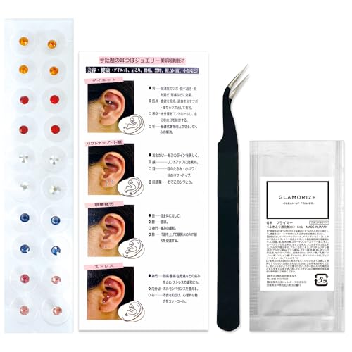 耳つぼジュエリーのスターターキットです。4点セットで、20粒の耳つぼシールが含まれています。セルフで簡単に使え、チタン製の銀粒が特徴。説明書も付属しており、お試しやトライアルに最適です。