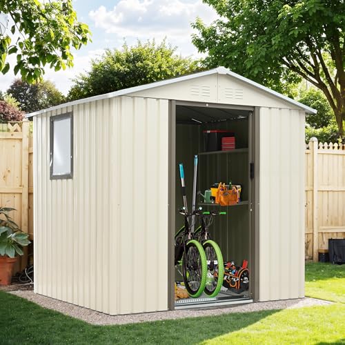 屋外用のスチール製物置で、可動棚と床材補強フレーム付き。防水・防錆機能があり、すべり出し窓や人字形屋根を採用。収納力抜群で、おしゃれなデザイン。ガーデニングや庭の整理に最適。