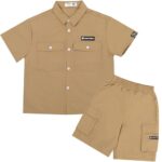 ジュラシック・ワールドの子供服、半袖Tシャツとショートパンツの2ピースセット。カーキー色でポケット付き。男の子女の子兼用、夏のカジュアルウェアとして最適。エクスプローラーやアウトドアにぴったりのデザイン。