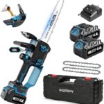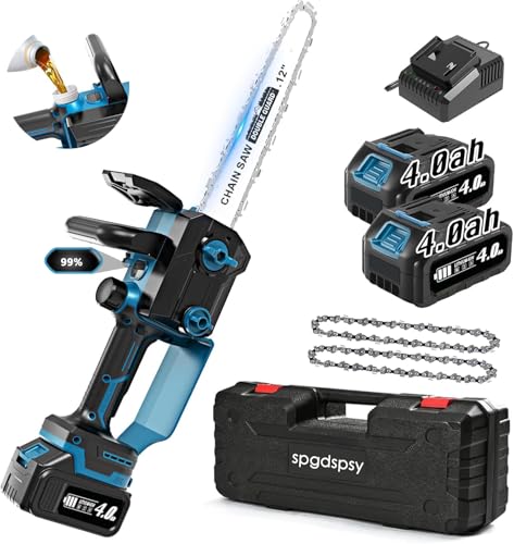 2025年高性能強化版の充電式チェーンソー。12インチ、1100Wブラシレスモーター、14.6m/sの高チェーン速度、62dB低ノイズ。4000mAhバッテリー2個、軽量1.6kg。自動給油と工具不要のチェーン調整機能搭載。PSE認証済みで日本語説明書付き。