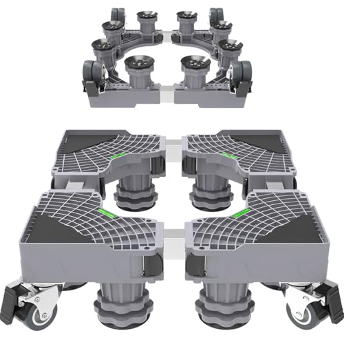 Yumcuteの洗濯機台は、防水パン付きでキャスターとブレーキがあり、8足4輪の安定性を持ちます。ステンレスフレームで耐荷重500kg、減音防振効果もあり、伸縮式で360度回転が可能です。