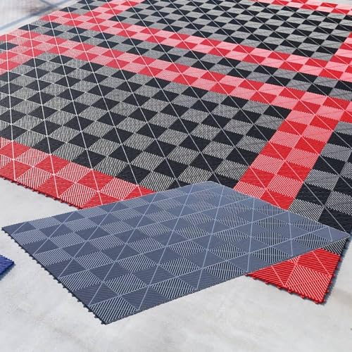 UPstoreのガレージタイルは、40cm×40cmの連結可能なマットセットで、耐荷重10t、強化PP製。高通気性で車やバイクに最適。カラーは赤で、10枚入り。簡単施工で駐車場やショールームにも対応。