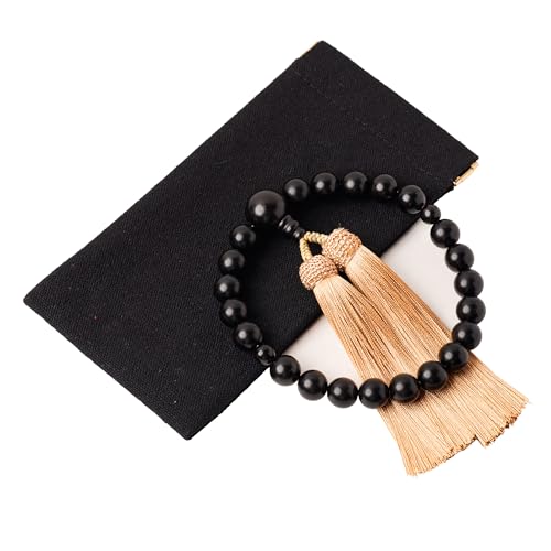 男性用の数珠で、材質は縞黒檀、艶あり仕上げの25玉タイプです。葬儀や法事、墓参りに適し、全ての宗派で使用可能。付属の数珠入れとカーキ色の房が特徴です。