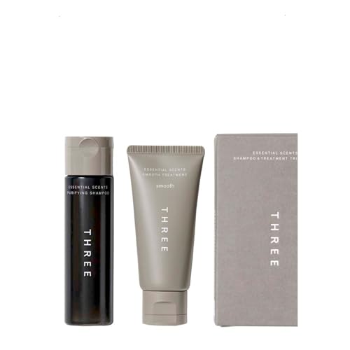 THREE エッセンシャルセンツ シャンプー&トリートメント トライアルキット Sは、自然由来の成分を使用し、髪と頭皮をやさしくケア。潤いとしなやかさを与え、リラックスできる香りも魅力です。