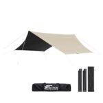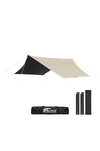 FIELDOOR完全遮光ヘキサタープは、530cm×570cmの大型サイズで、UVカット・遮熱機能を備えています。4〜6人用のテントポール2本セット付きで、アウトドアやBBQに最適です。