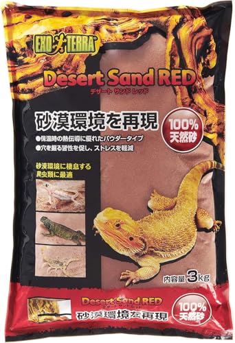 EXO TERRA デザートサンド レッド 3kgは、乾燥系爬虫類に最適なパウダータイプの天然砂です。砂漠環境を再現し、爬虫類の生育に適した自然な底砂として人気があります。