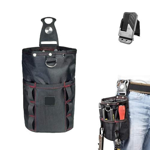 Prudencroseのバネ式腰袋は、釘袋2段に着脱式ホルダー付き。防水ナイロン製1680Dオックスフォード布使用で、DIYや電工向けに最適。黒と赤のデザインで小物整理にも便利です。